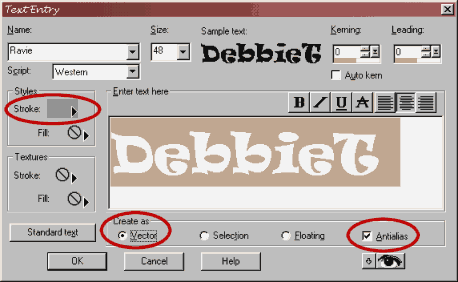 4. Once your option settings are chosen, click once on your canvas. The Text Dialog Box appears. Choose a thick font, good for your neon sign. I am using Ravie size 48. Stroke is GREY. Fill and Textures are NULL. Check VECTOR and ANTIALIAS settings.